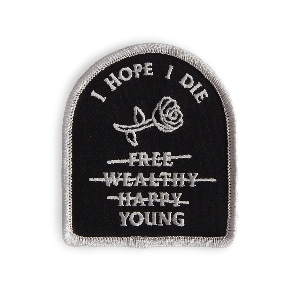Everyday, I pray, to DIE YOUNG. Pick up the patch now! 2.5" x 3" embroidered patch with iron on backing. Classic tombstone shape. By Hungry Ghost Press @hungryghostpress